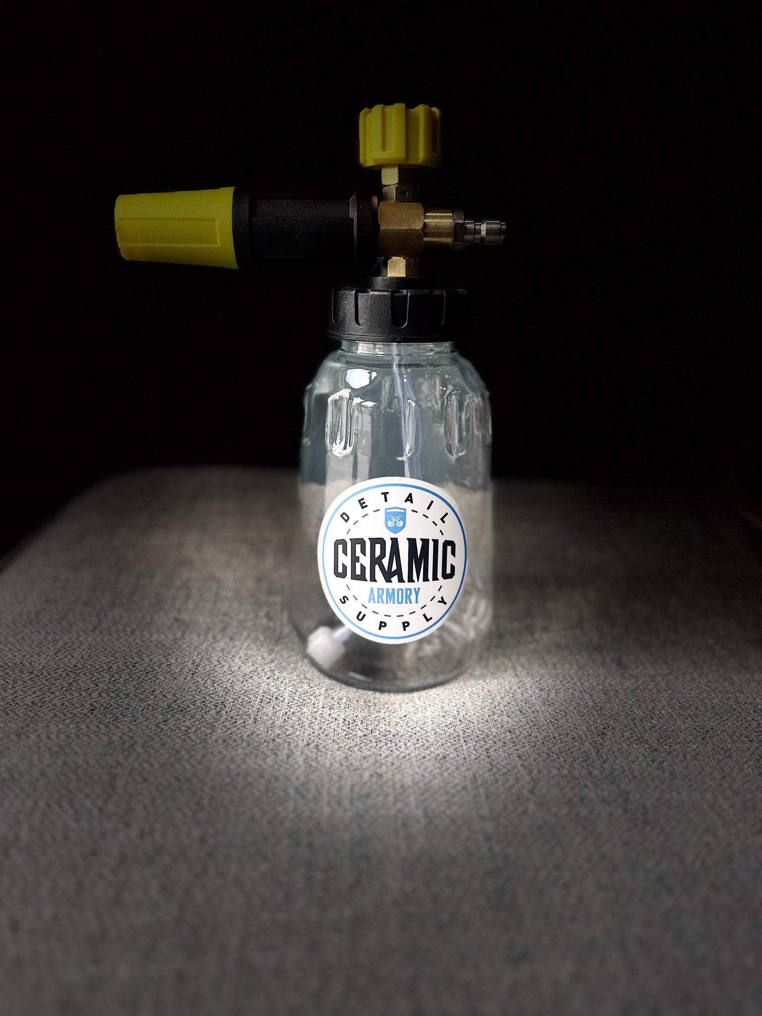 This cannon is used to apply a layer of foam on your vehicle's surfaces before washing. The foam helps loosen dirt and grim from the surface making it easier to clean and reducing the chances of scratching the paint.